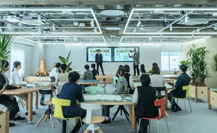 物事を本源から見つめ直し、ありたい社会や、人と企業の可能性をともに探求する。あたらしい共同創造の場「Root」をはじめ、アジリティオフィス「Base」・工房「Soil」を構える東京本社。官や民の枠を越えて様々な人が集まり、共創が生まれています。
