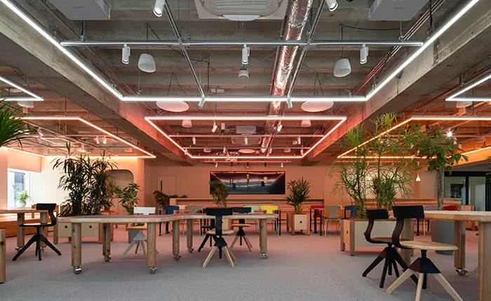 一人ひとりの学びと認識をアジリティに掛け合わせさらに深めていく、日々の生産活動の拠点です。ワンフロア内には、自然光に近い有機ELを採用。心地よいオフィス環境下で個々が自在に動き、互いに活発に意見を交わしています。