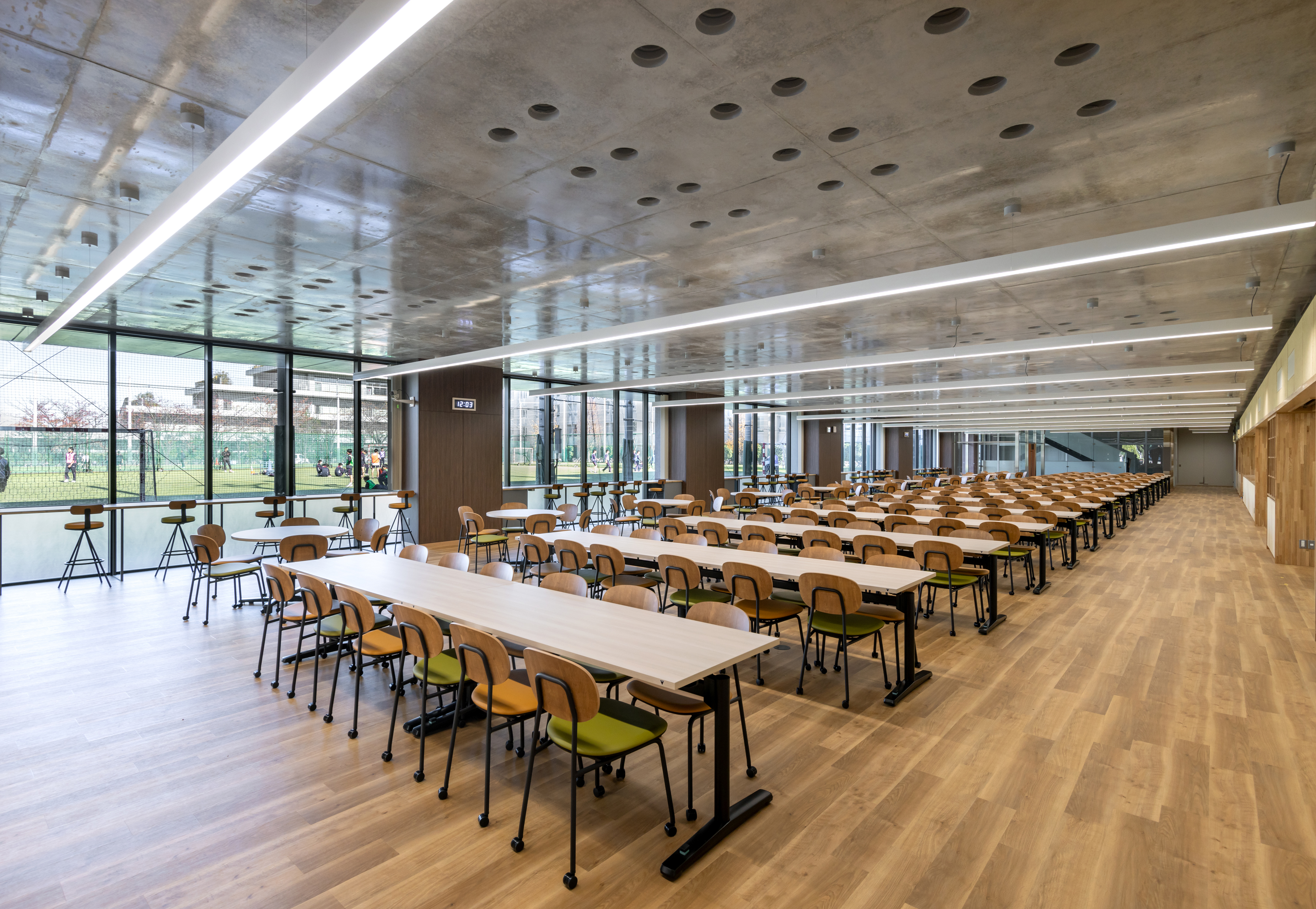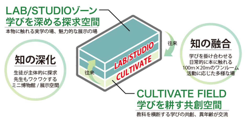 今回特別教室棟として、1階には、学びを耕す共創空間=知の融合を期待し、自発的に使えるラウンジ(1期)や図書館(2期)を20m×100mの一面フラットスラブの一体空間に配置し、教科や学年を越えて学びを掛け合わせる「CULTIVATE FIELD」とした。