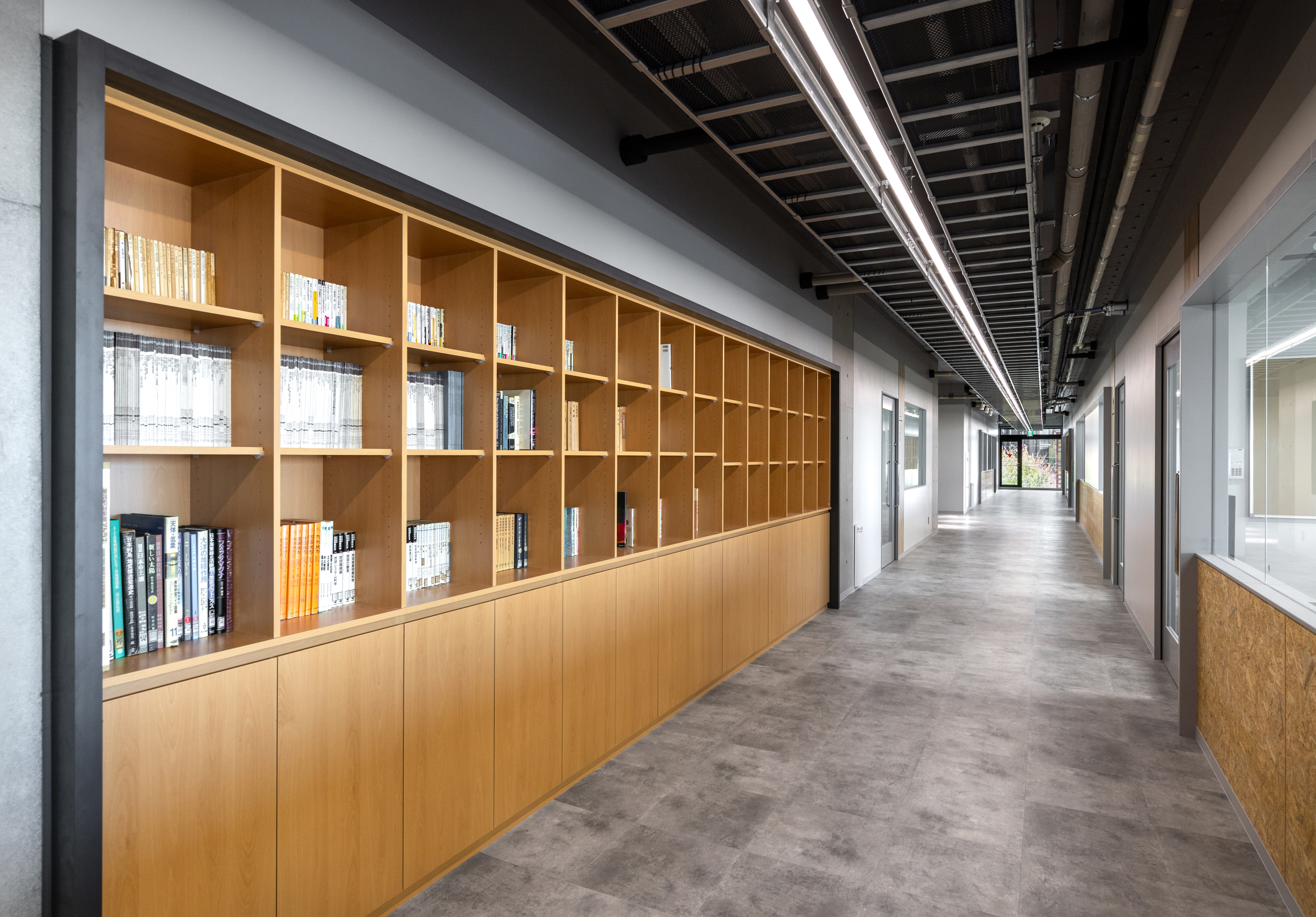 廊下に面する間仕切り壁も、特別教室の用途に応じて展示棚や教室内の様子が分かるガラス開口を設けており、多様な空間のつくり方を実現した。