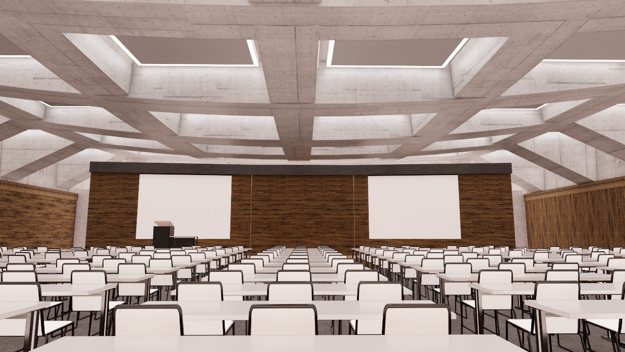 既存建物との制約や高さ制限等の条件から、本建物では講堂を地下に配置する計画とした。一方で、講堂の特性上無柱空間が必須の条件であり、上階との柱配置の関係でお神楽形状となる。その条件を複合的に検討し、上階の力をワッフル上の梁で受けることで、力を分散させ、梁サイズを抑制する計画とした。加えて、上階の柱から受ける応力を解析し、応力に応じて梁せいや形状を変更することで、力の流れを可視化しつつ、講堂の天井のデザインとした。