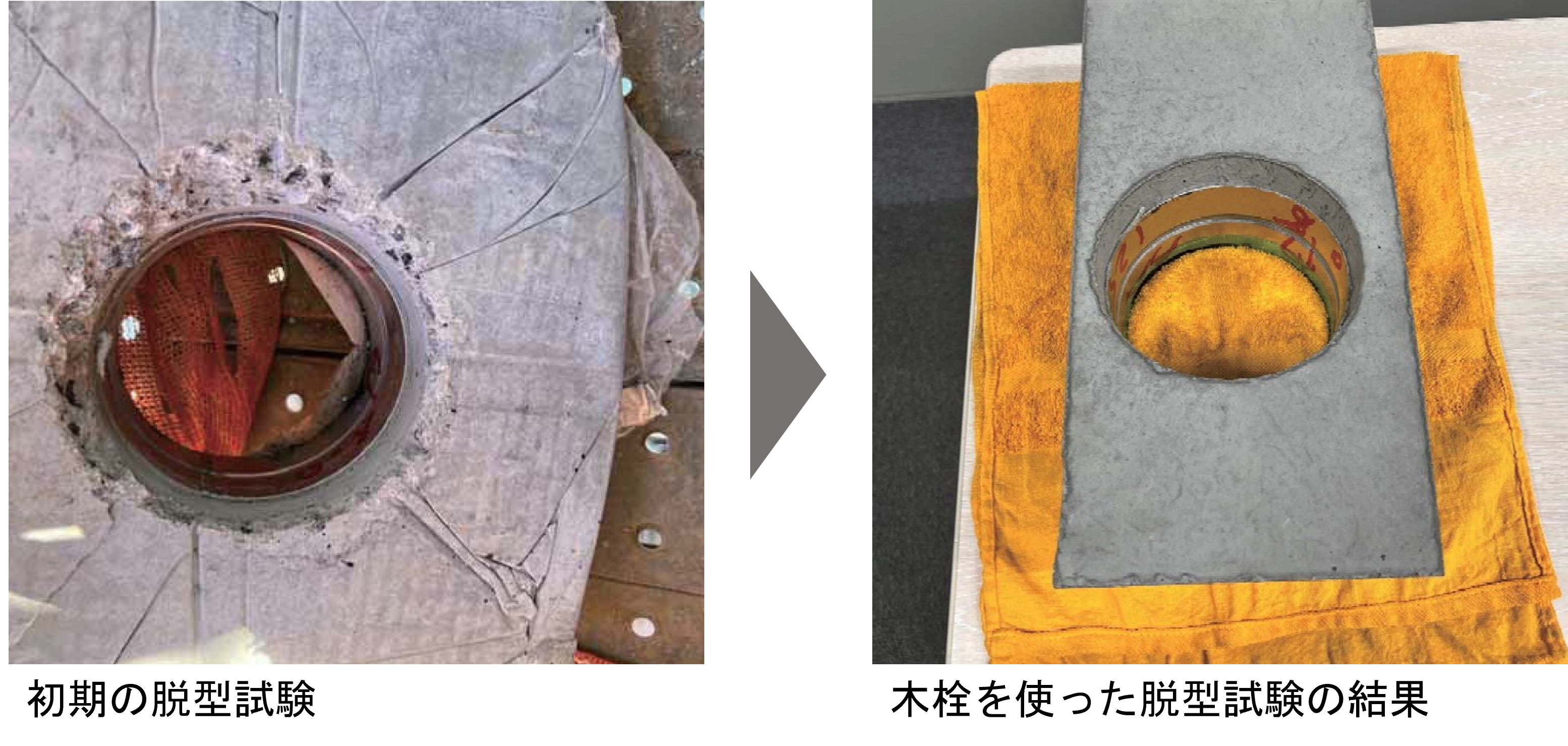 2点目は打設後の脱型の検証。ボイドスラブ裏はそのまま天井仕上となるため、設計段階、現場段階でサンプルを作成し、脱型実験を行った。結果として、木栓を型枠に取付けることにより、デザイン性能を満足する駆体の実現につながった。