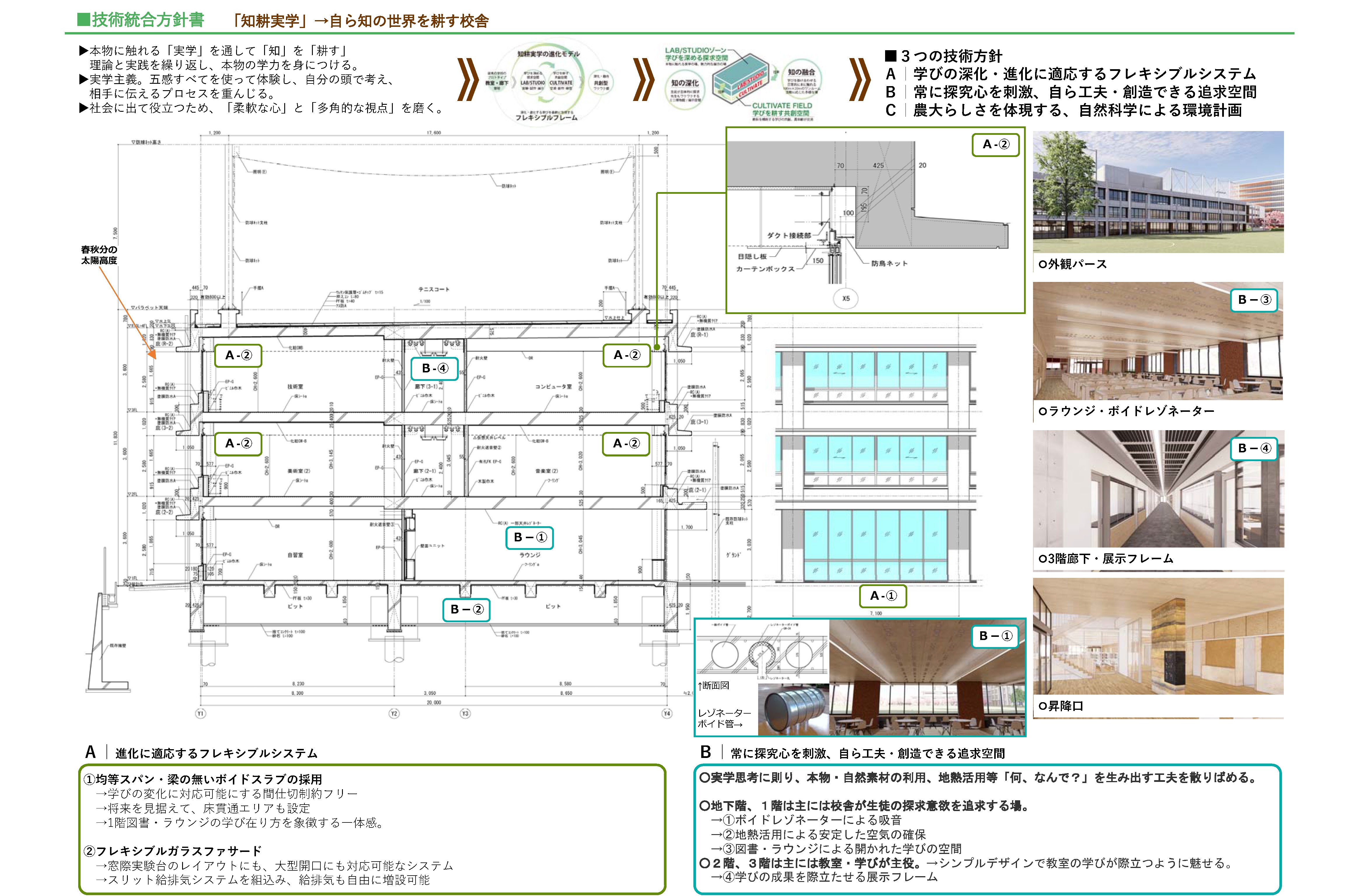 今回、特別教室棟の建替えを通じて、「知耕実学」をより深化させる学びの場を建築として如何に体現するかを設計のテーマとした。