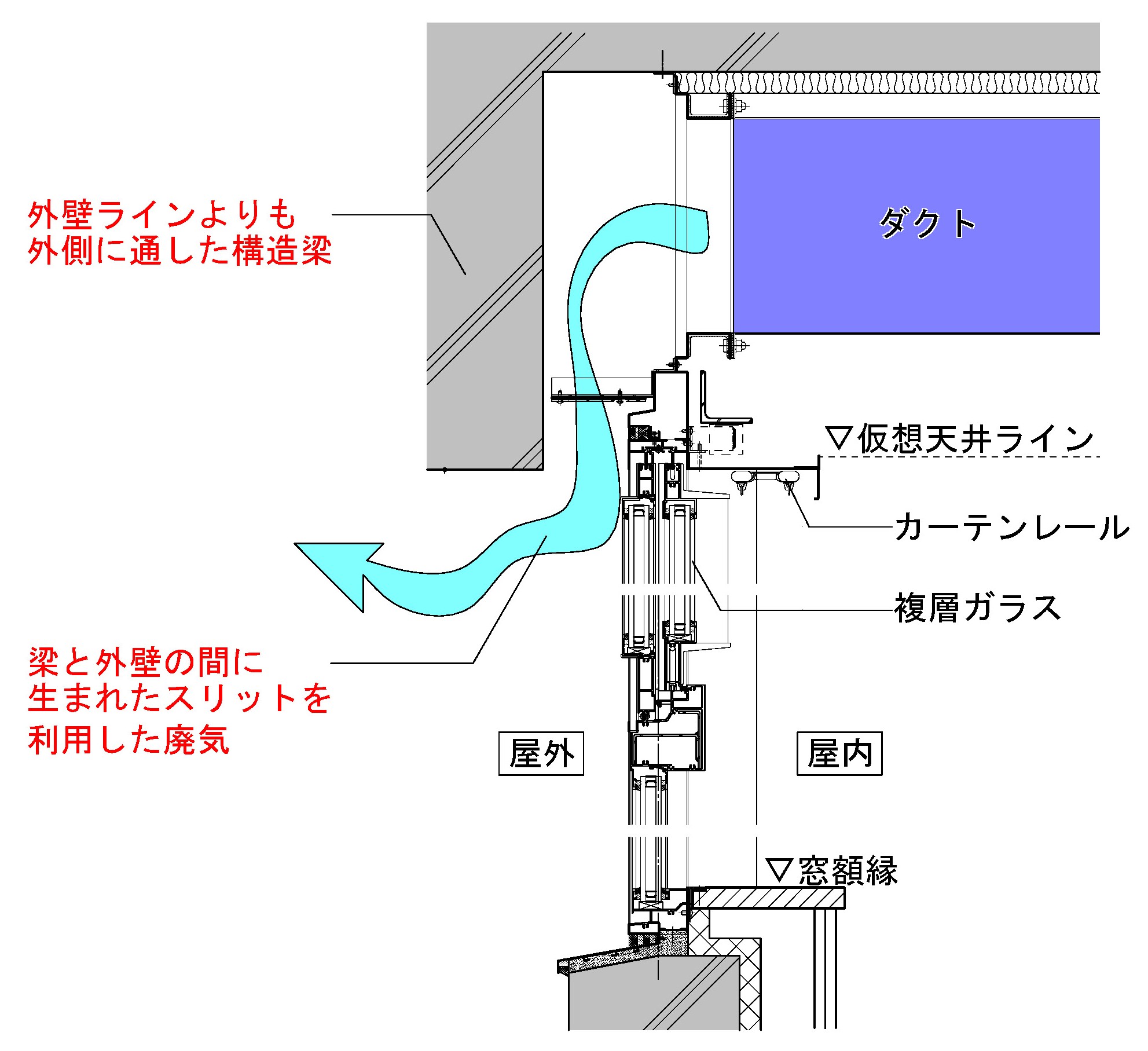 特別教室は火気利用や局所排気などで、給排気設備が増えやすい。予備スリーブ方式は、ダクト寸法や位置が固定され将来自由度が下がる。そこでスリット型給排気を採用した。外周梁を外壁ラインより外側に通し、梁と外壁の隙間を給排気経路に利用する。給気と排気は離して配置し、ショートサーキットも防いでいる。