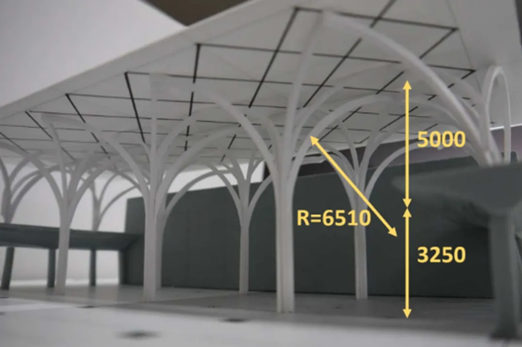 平面的に三角形トラスをアーチ状に架け、下に凸となった花びら状のパーツを取り付けています。さらに花びらの先端をタイバーで結ぶことで、木造部材量を適正化しつつ、大スパンを実現しました。タイバーは、形態的な面白さが際立つよう、花びらの頂点をリズミカルに交互に結ぶ配置に最終決定しました。花びら中央の接合部では、6本の木部材が集まるため、木部材に内蔵した鉄骨芯材から接合プレートを出す納まりとすることで、タイバーの取り付けも容易にしています。