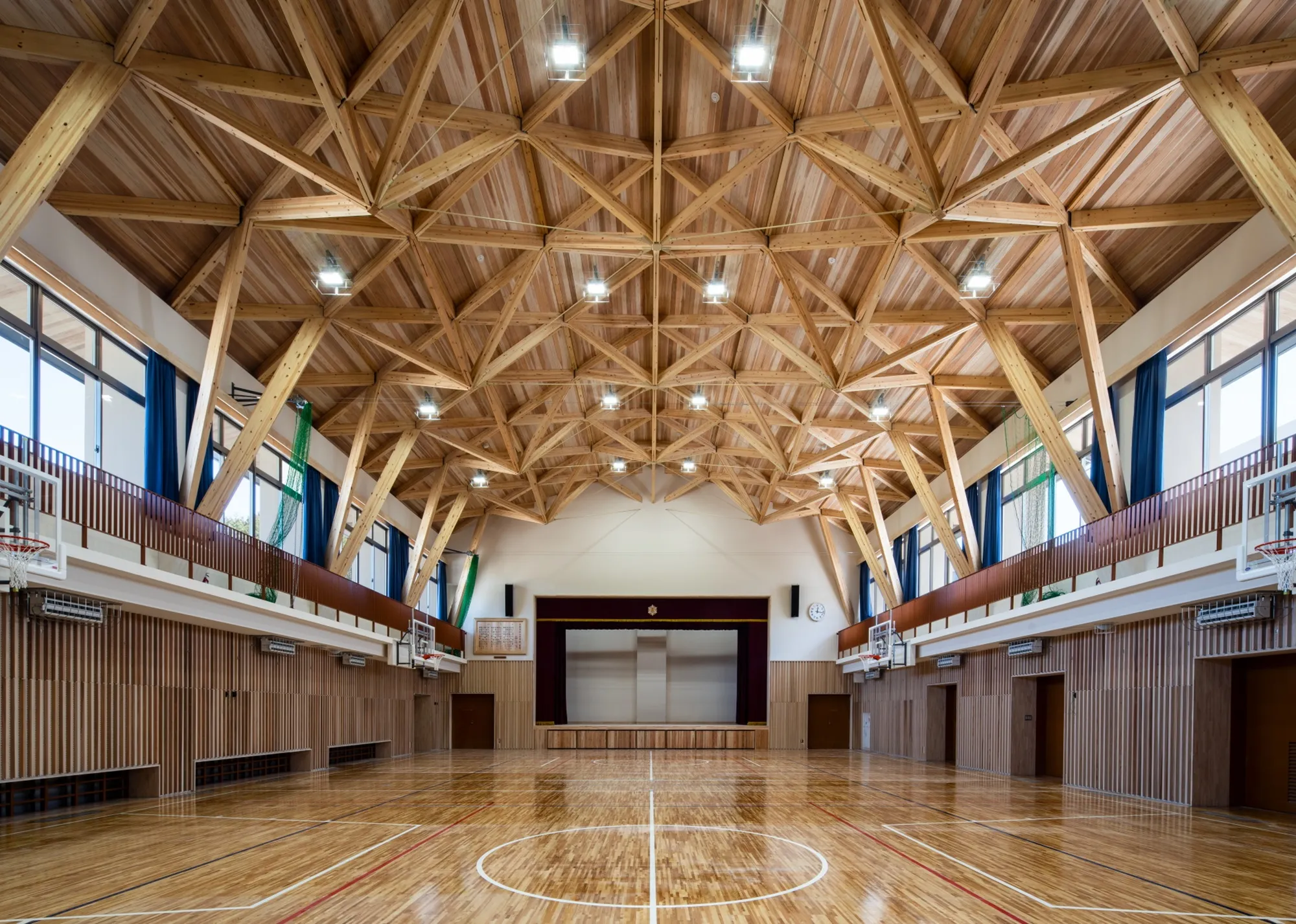 体育館は、「包まれたような柔らかい空間」を目指し、RC 柱+木トラスによる大スパン架構(19m)を採用しました。