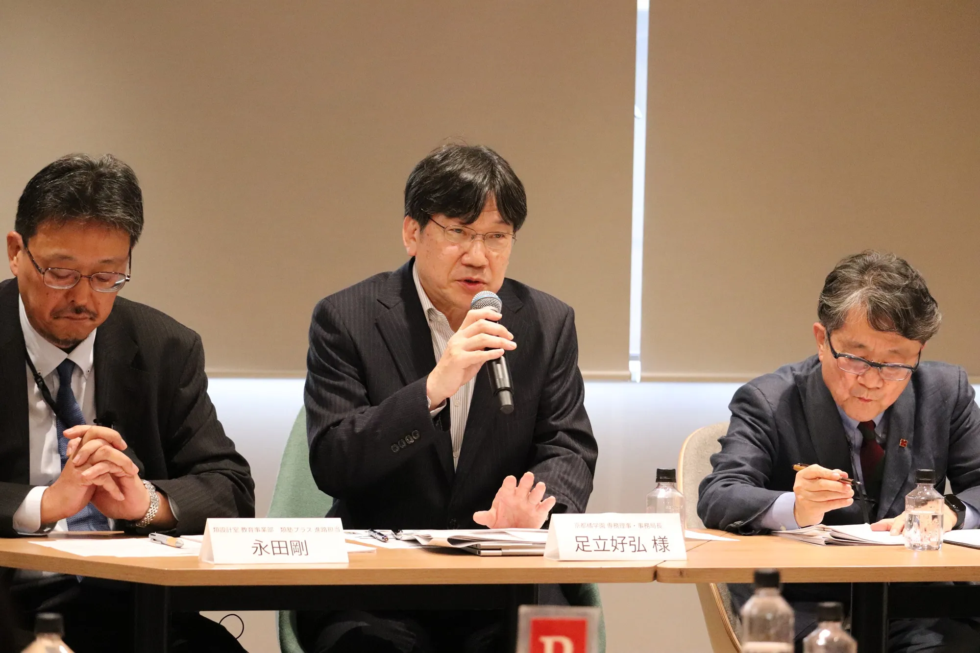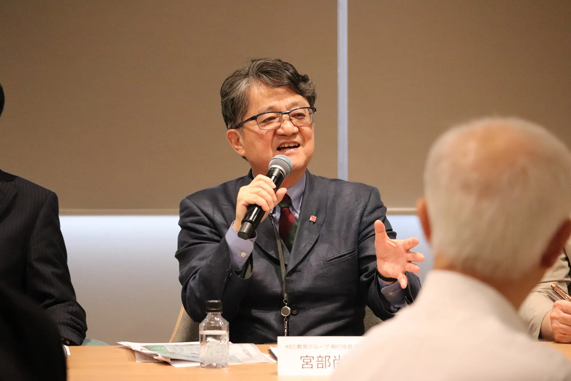 続いて、石原氏の講演内容を受けて、パネルセッションを実施しました。登壇者は、石原氏に加え、大阪成蹊学園 理事長の北本暢氏、KEC教育グループ執行役員 事業本部長の宮部尚氏、学校法人京都橘学園 専務理事・法人事務局長・財務部長の足立好弘氏、類設計室 教育事業部 類塾プラス 進路担当の永田剛氏。モデレーターは大手前学園 常務理事の高本進氏につとめていただきました。