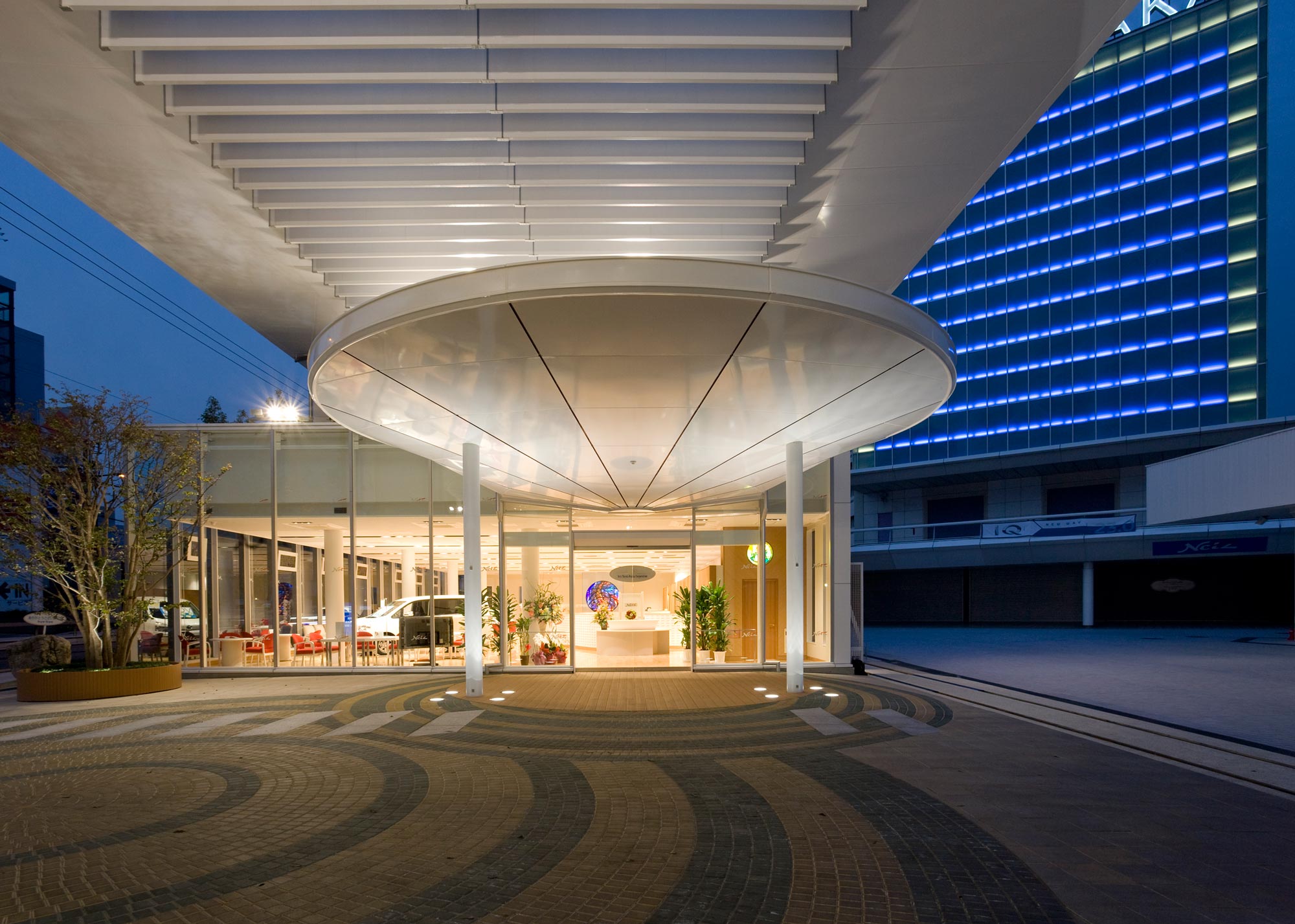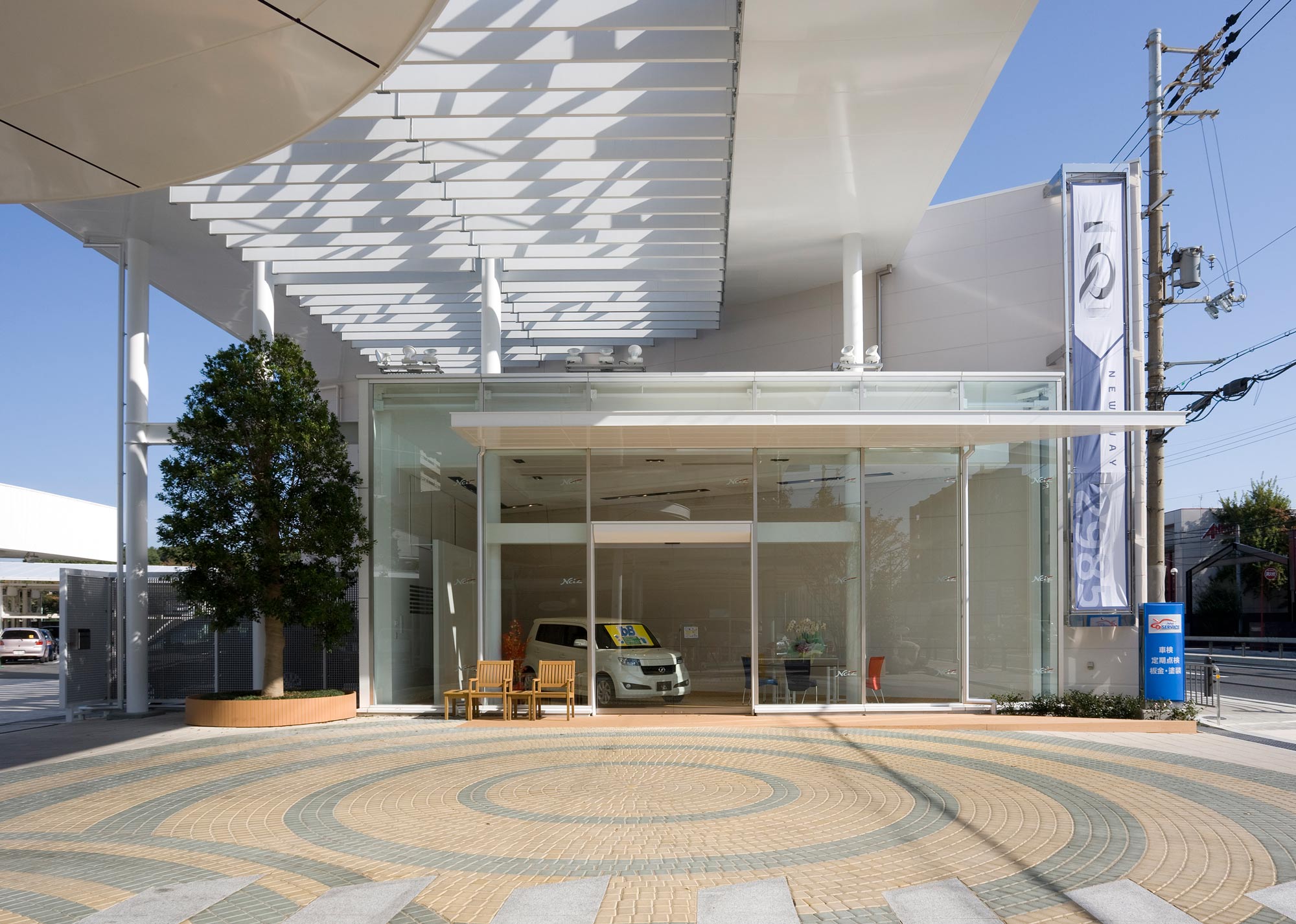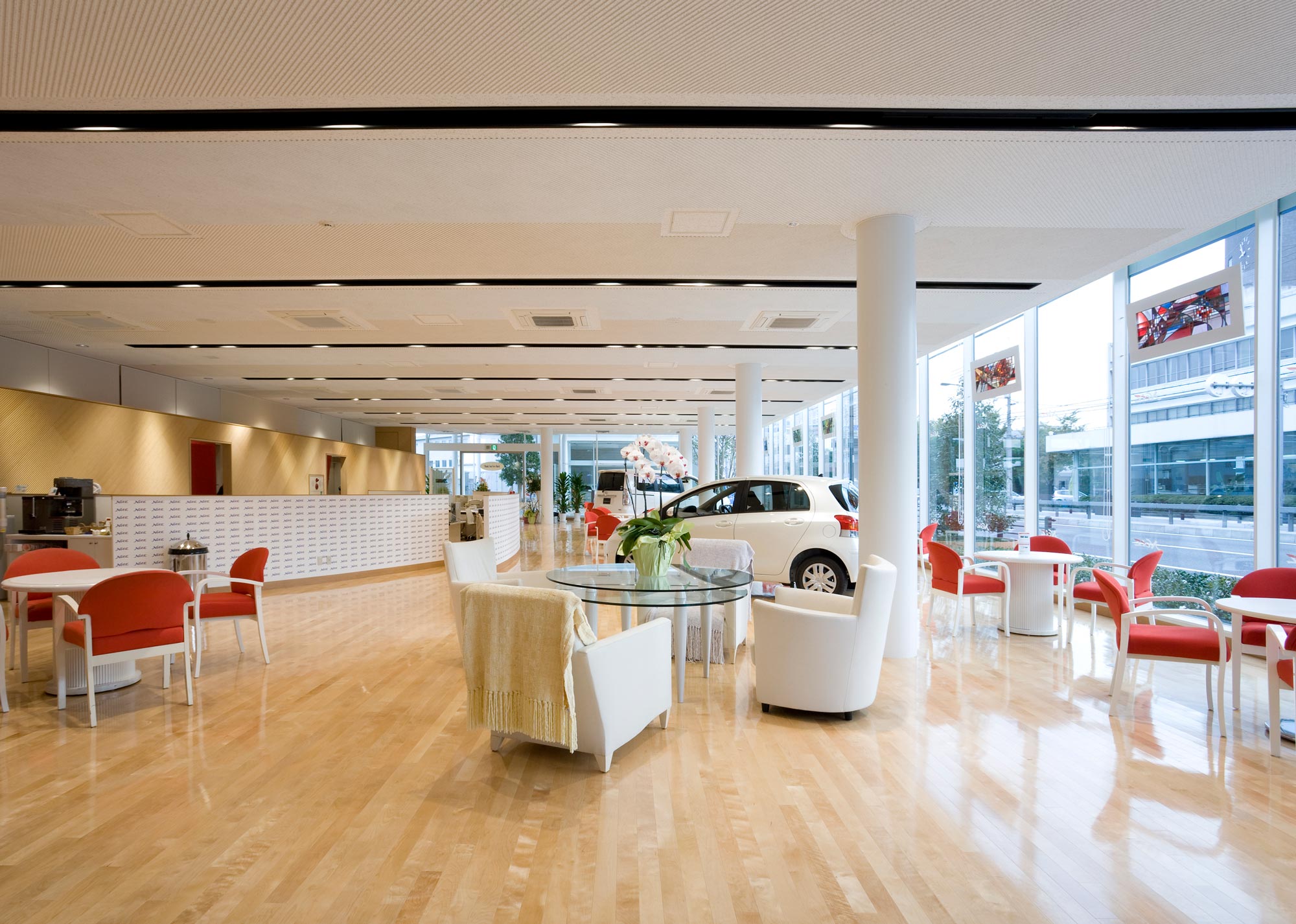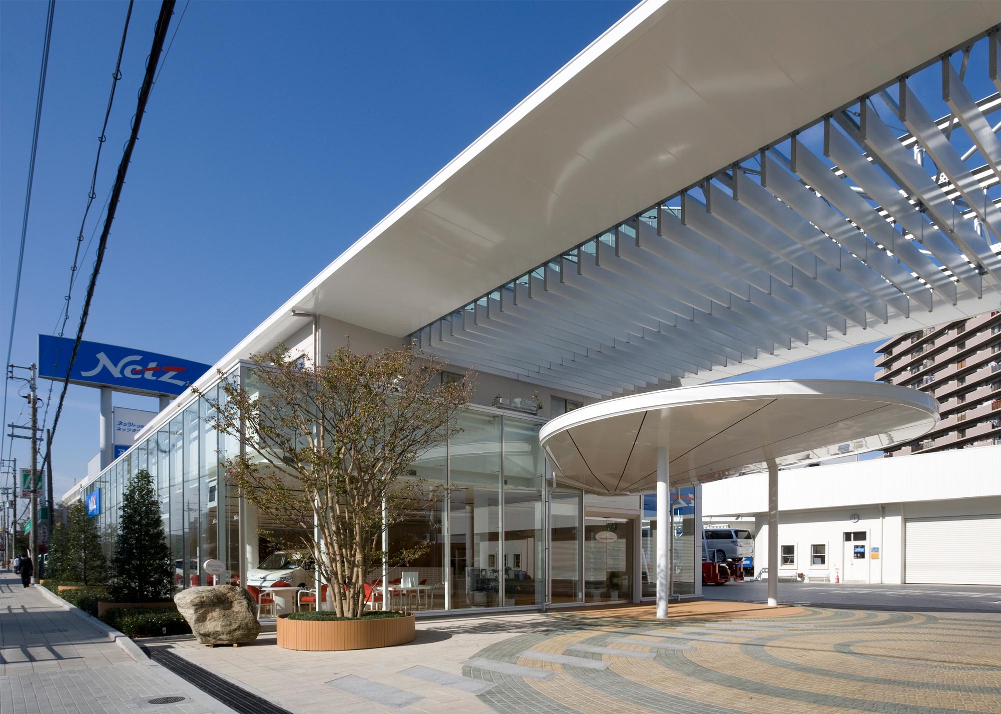 ネッツトヨタ大阪の発祥地である守口店を、新しいネットタウンの基幹店として新設する計画。自動車販売の環境変化をとらえ、女性客に魅力のあるものとして計画した。①ガラス張りで清潔感、透明感を出す。②店舗内部、外部を緑化し、くつろぎのスペースとする。③販売店舗とサービス工場の中間にパーゴラの半外部空間をつくり展示車・イベントスペースとする。④来客用WCは、化粧室・授乳室兼用の個室とし、ライトコートに面した明るい空間とした。