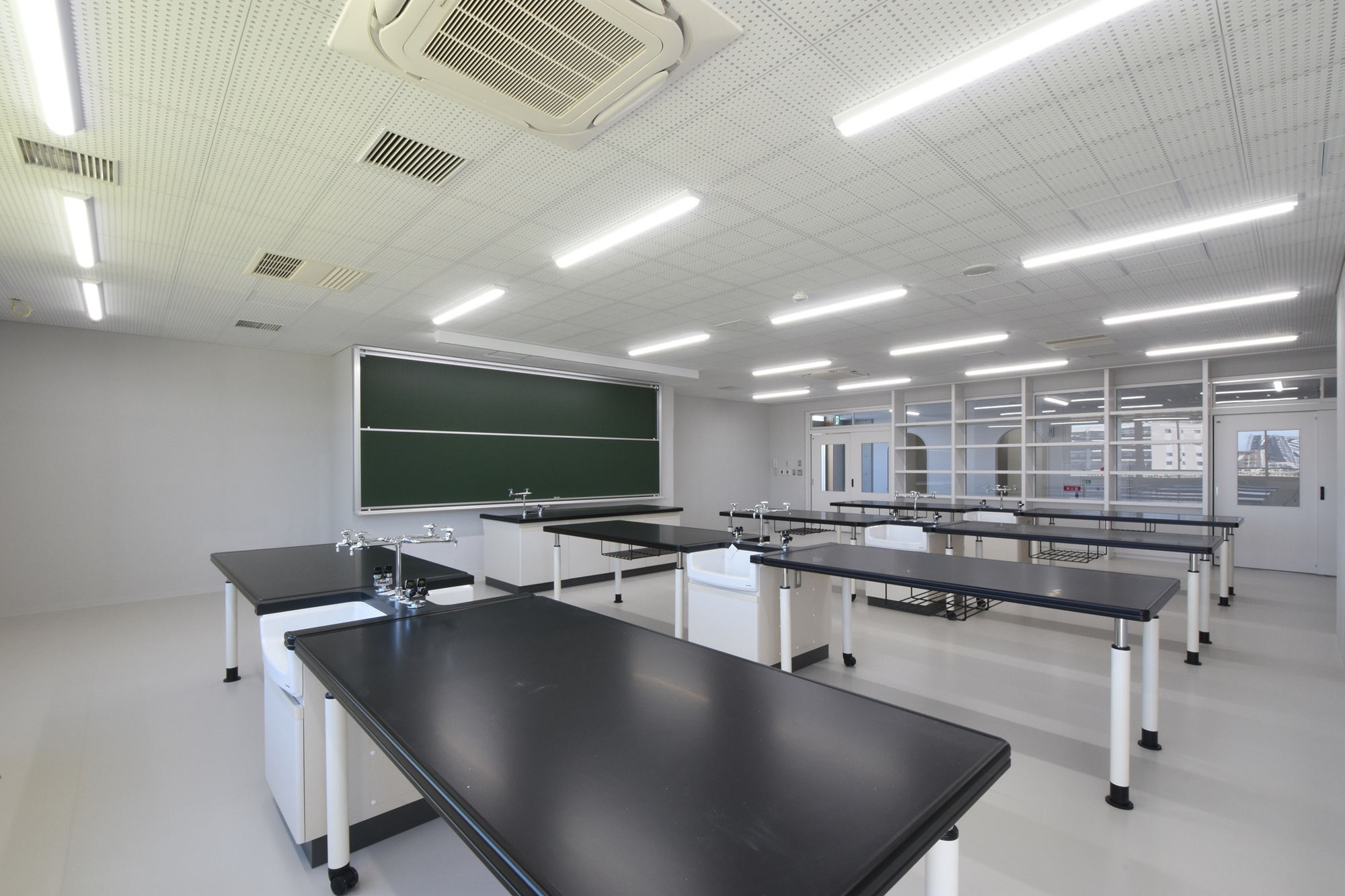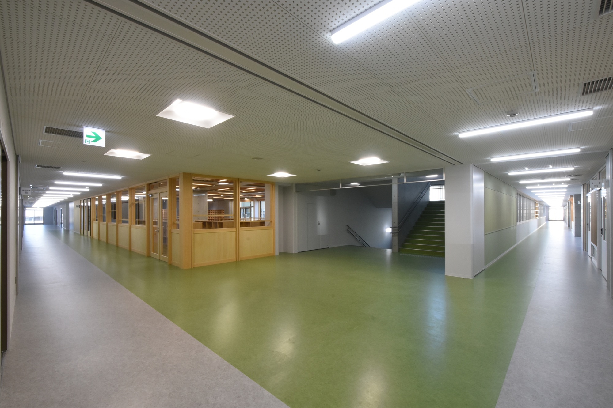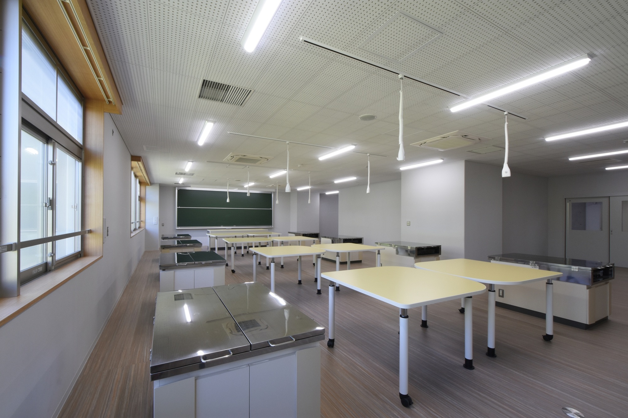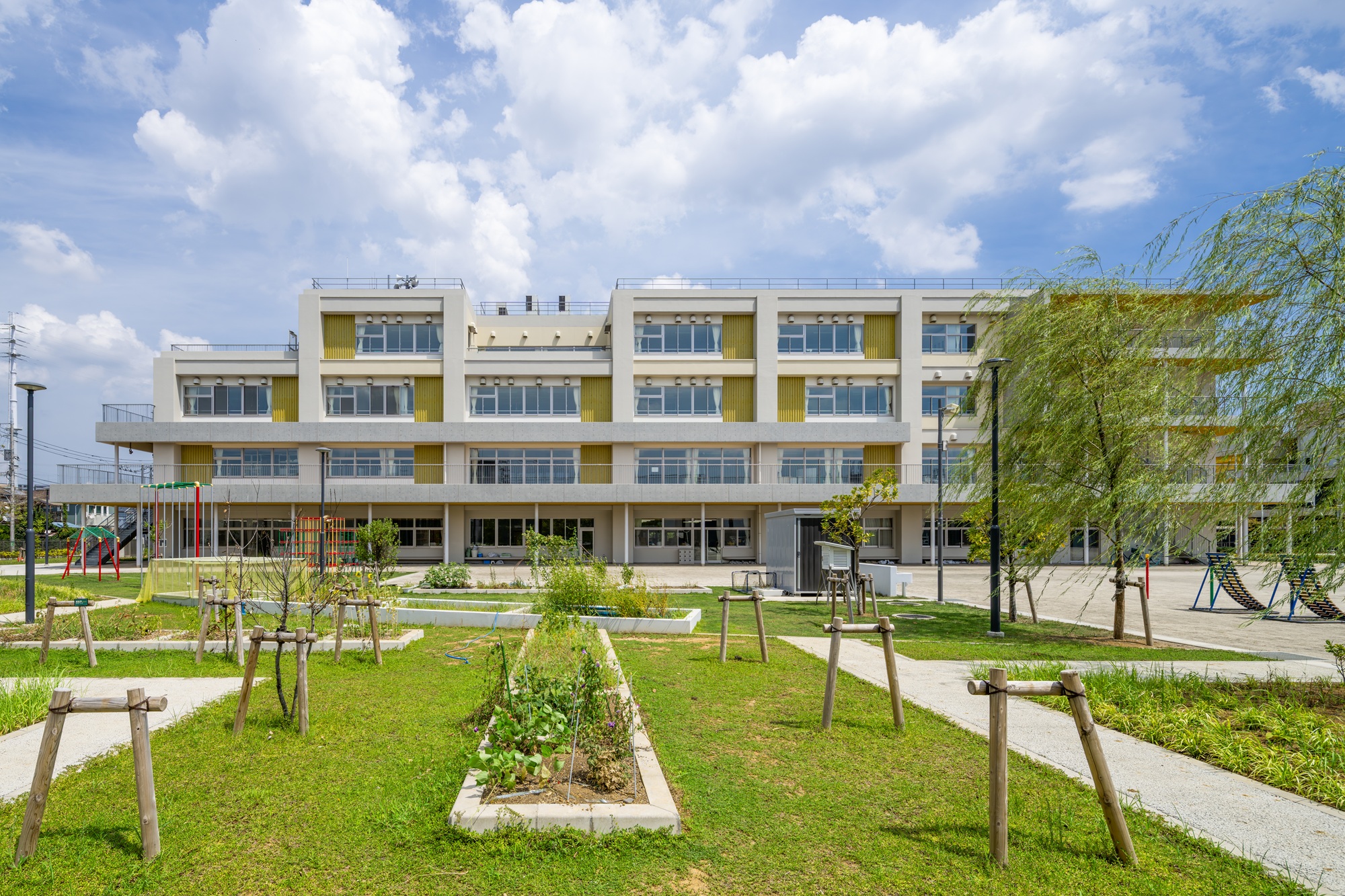 建築計画の特徴は、心地よい光と風につつみこまれる自然と共生する校舎を工夫しました。回遊性のある廊下、生徒・児童の作品展示スペースとなる出窓、中間期の自然の風をそよ風のように室内に取り入れることができる小窓など、時間や季節の移ろいを感じられる空間をつくりだしています。