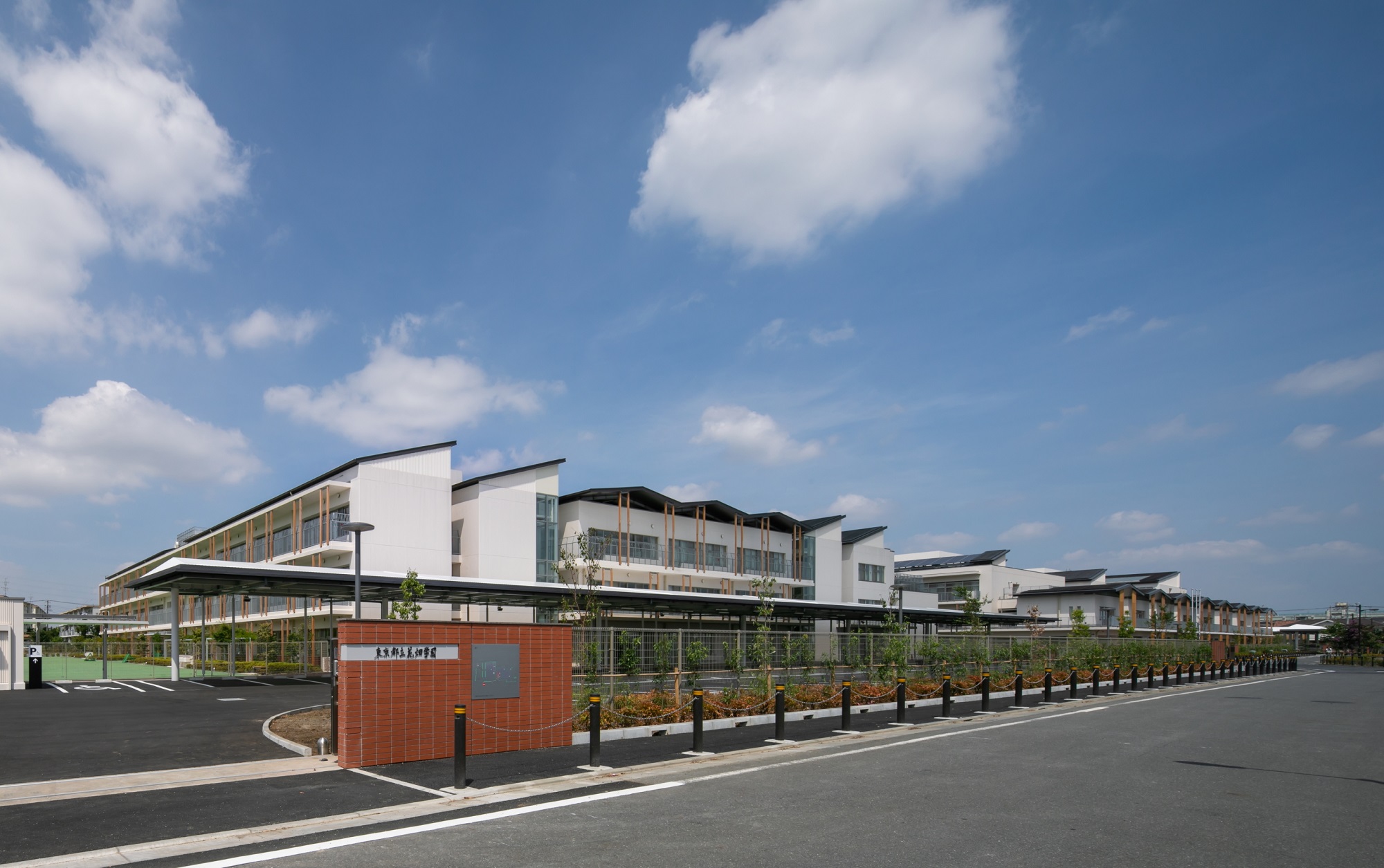 本校は知肢併置校です。そのため、両部門の教員の専門知識を共有し連携を強めることが多様な障害への対応を可能にすると考え、職員室は知的障害と肢体不自由の2部門を一体化しました。インテリアは生活空間である”まち”に見立てました。普通教室は生活拠点である住宅、作品展示などを行う展示棚を設けた特別教室は”みせ”、大勢が集まる訓練室などの共用室はまちの”ひろば”をイメージし、みちに当たる廊下から活動内容がよく見える設えにしています。外観は、周辺の住宅の街並みに調和するよう教室ごとの勾配屋根が連続するデザインとしました。