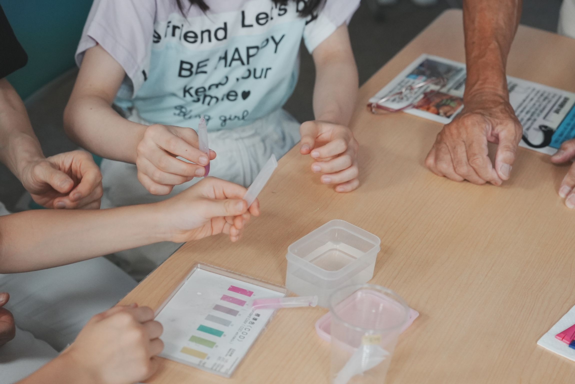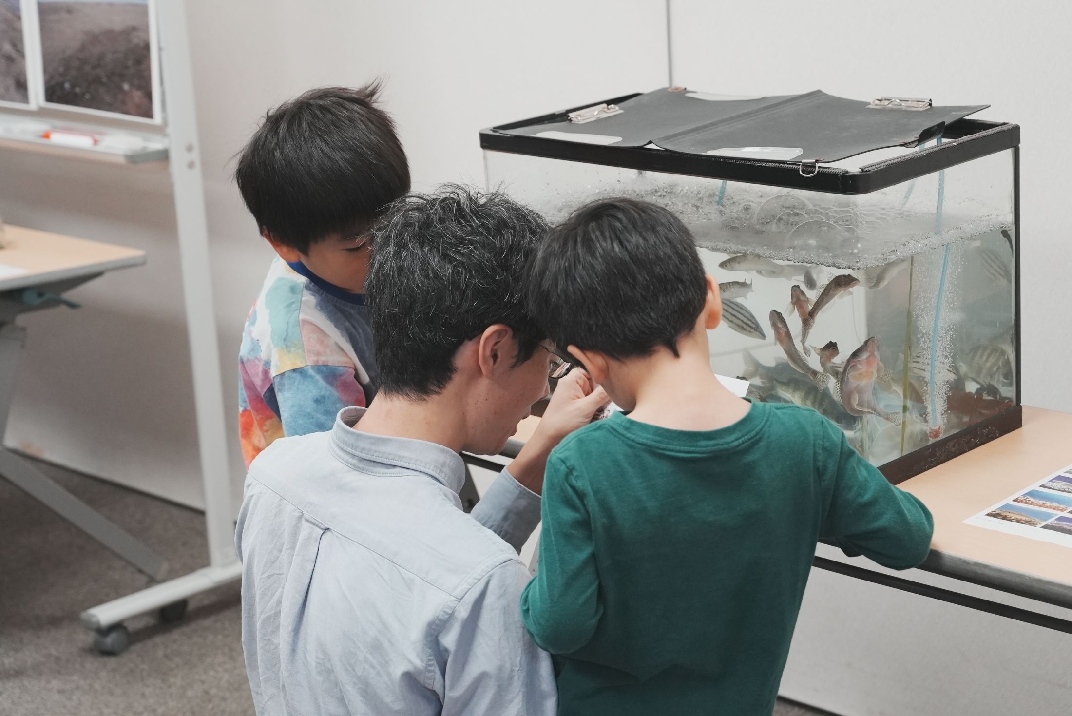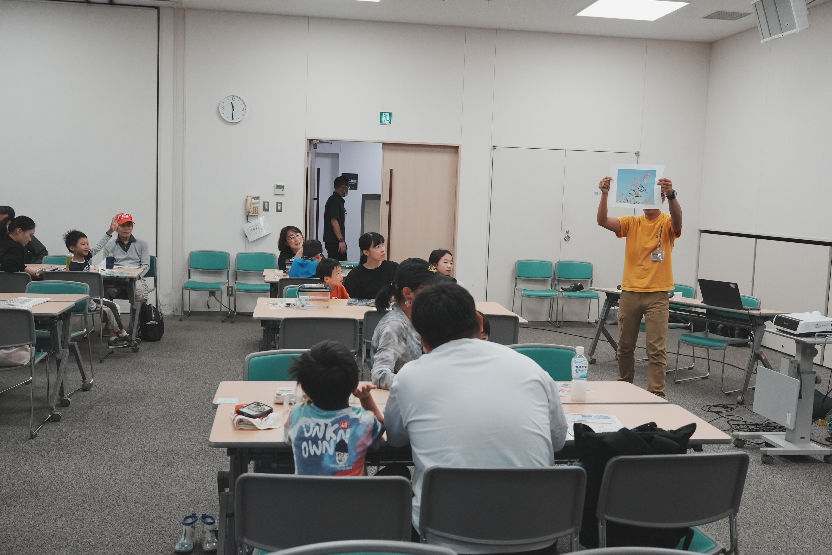 当日は悪天候により、急遽淀川区役所会議室での室内プログラムへ変更となりましたが、淀川の歴史についての講義や水質試験キットを使用した淀川の水のきれいさ実験チェックや、淀川に生息する生き物の観察、たも網を使った漁具体験など行いました。