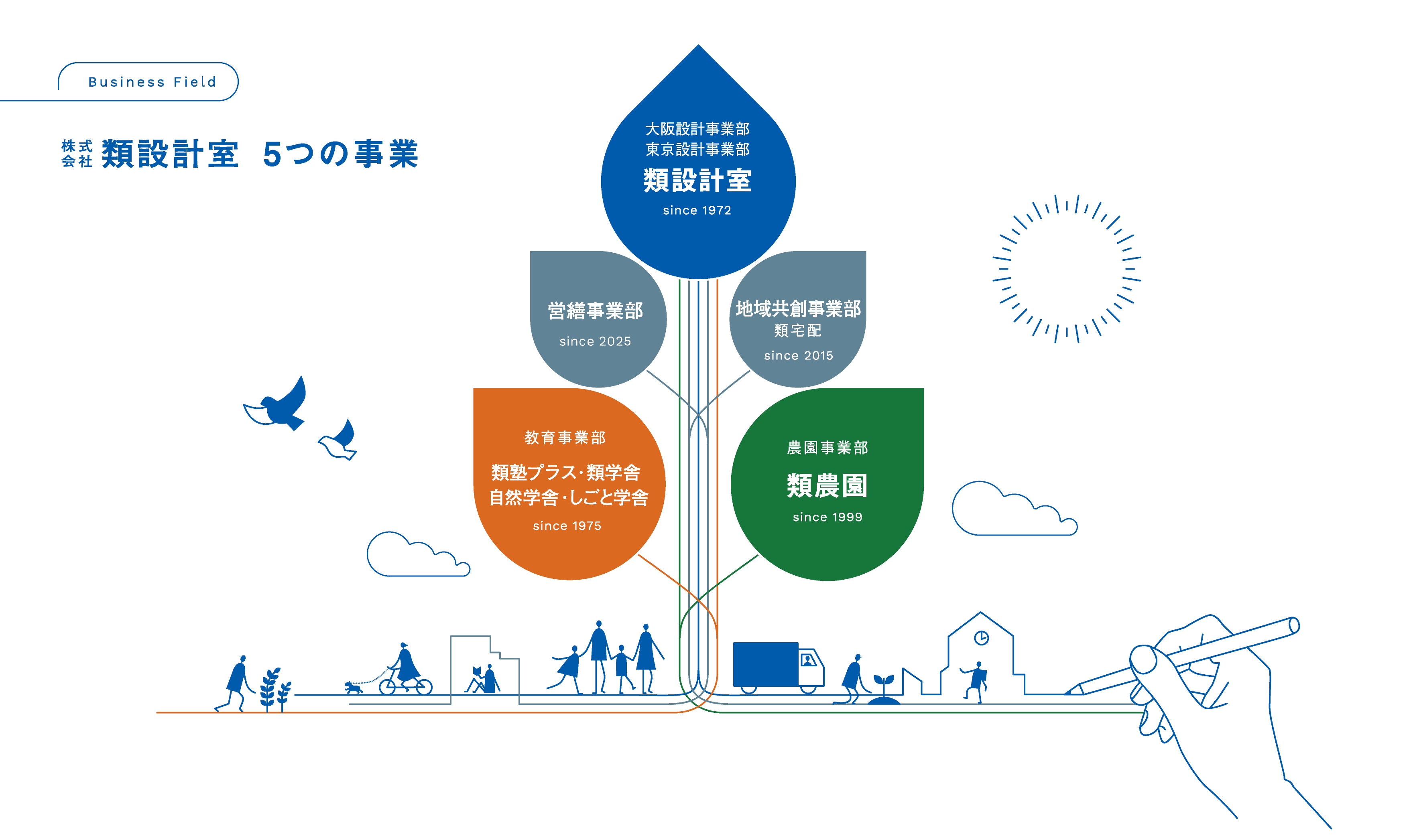| 事業部・業務内容 | 大阪設計事業部・東京設計事業部 事業構想:将来マスタープラン、新たな働き方•学び方•まちづくりのコンセプト構築 設計・監理:建築設計、都市計画、インフラ計画、ワークショップ、工事発注支援 営繕事業部 施設運用:施設再編マスタープラン、改修・リノベーション設計監理、施設情報整理、遵法化コンサル、使い方調査 維持管理:省エネ・維持管理コンサル、PM・CM発注支援、補助金財源コンサル 教育事業部 ・類塾プラス 大阪北摂を中心に6教室とバーチャル校を展開する進学塾 ・類学舎 全日制の 社会に一番近い学び舎 ・自然学舎 山林探索/本格農業/本格宿泊・日帰り企画/食農みらい塾 ・しごと学舎 こども建築塾・こども起業塾 農園事業部 類農園 ・奈良農場・三重農場:循環型農業、有機JAS認定取得 ・産直事業:独自の流通網構築 ・農業コンサルタント:企業・行政・地域と連携、地域再生 地域共創事業部 類宅配 ・ポスティング事業 ・宅配網の組織化 ・地域モニタリング、立地戦略提案 ・地域共創事業、まちづくり |