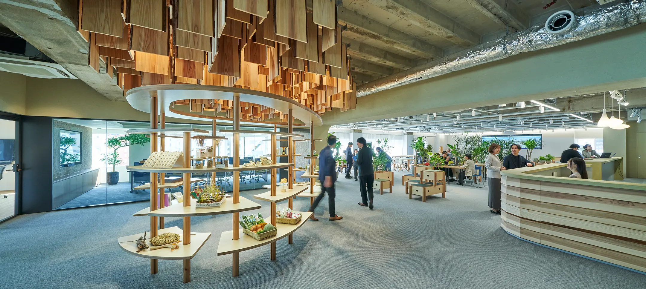 類設計室 東京設計室の6Fに生まれたあたらしい共創拠点「Root」。延床面積443.21m2のワンフロアに多様な用途に応じて有機的に変化する共創劇場をはじめ、社内外との共創が生まれる空間が広がっています。
